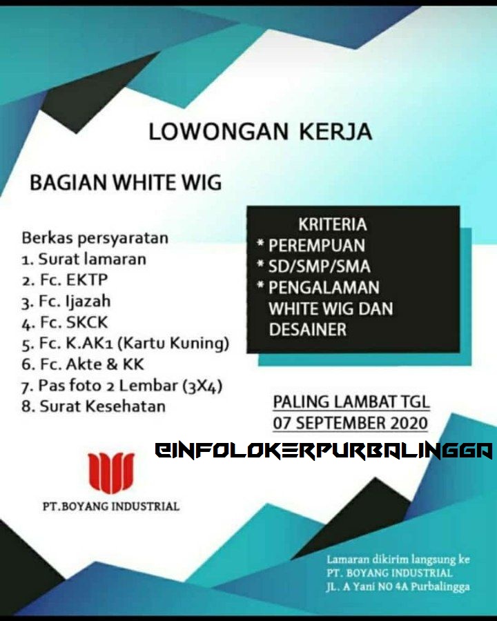 Syarat Pendaftaran Pt. Boyang Purbalingga - Syarat Pendaftaran Pt. Boyang Purbalingga : Syarat Pendaftaran Pt. Boyang Purbalingga : Apa itu .... Syarat usia wajib dibuktikan dengan akta kelahiran atau surat keterangan lahir, yang dikeluarkan oleh pihak yang berwenang, dan dilegalisir oleh lurah/kepala desa atau pejabat setempat lain sesuai dengan domisili. Berstatus sebagai tenaga harian lepas dan tenaga bantu (thltb). Lowongan kerja pt boyang industrial purbalingga info. Pt boyang indusrial purbalingga merupakan perusahaan yang memproduksi wig (rambut palsu) terbesari di indonesia saat ini sedang membutuhkan karyawan untuk posisi : 50 contoh surat lamaran kerja nsc finance berbagi resep.